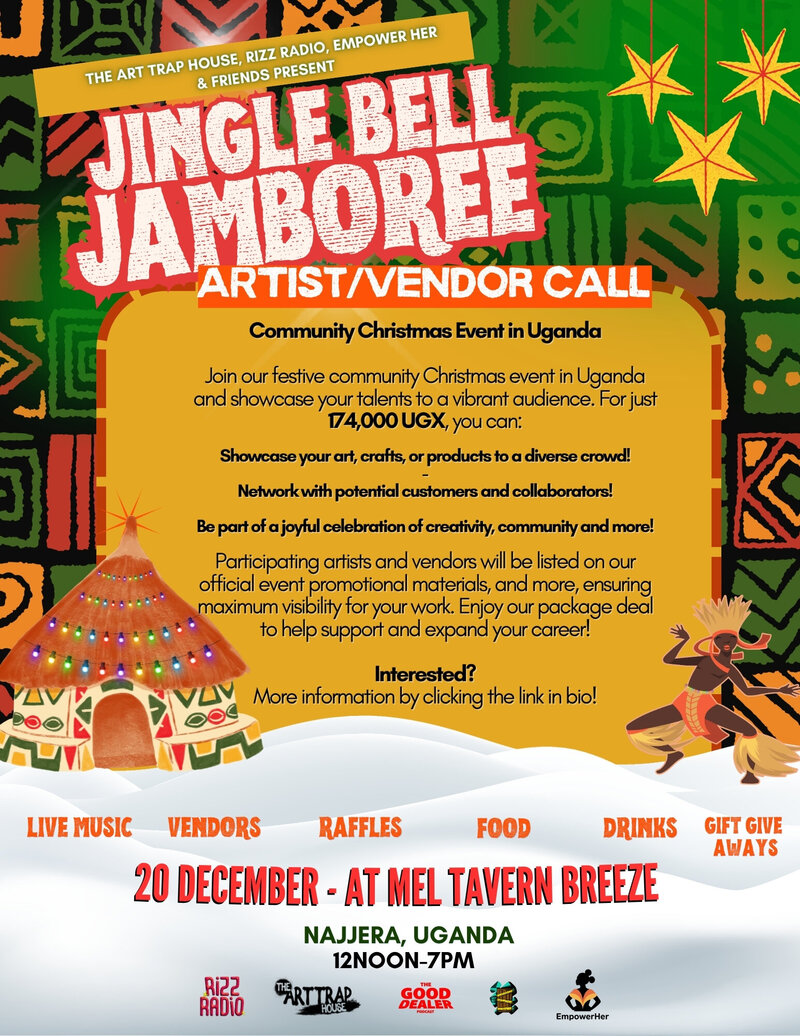 The Jingle Bell Jamboree is a heartwarming community event dedicated to bringing joy, creativity, and healing to orphaned children, families, mental heath, and the broader Ugandan creative community during the Christmas season and beyond. Our mission is to celebrate the spirit of giving through art, music, and connection — providing a safe, uplifting space that promotes mental health wellness, distributes basic essentials, and empowers individuals through creative expression and community unity.